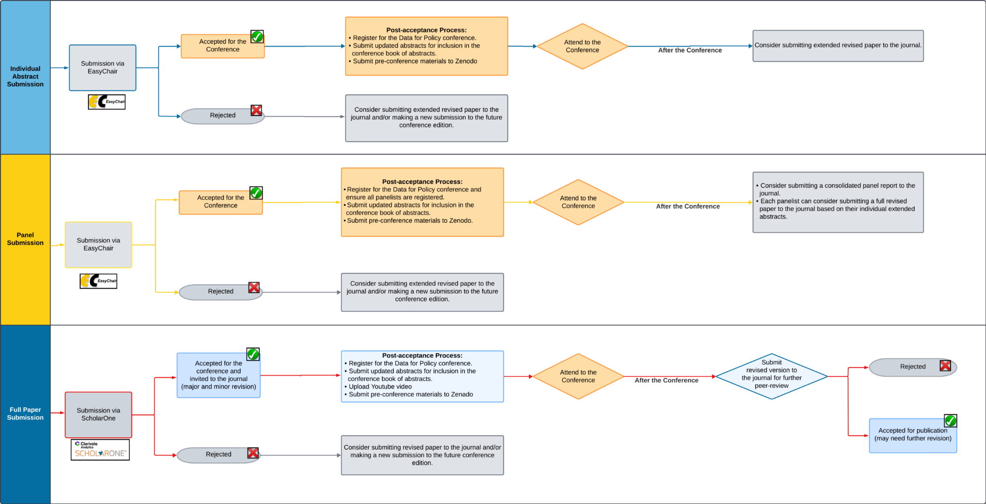 Full paper submissions benefit from an integrated review, allowing them to be reviewed concurrently for both conference presentation and journal publication. Upon conference acceptance, these papers will proceed to a second review stage for potential Data & Policy journal publication.