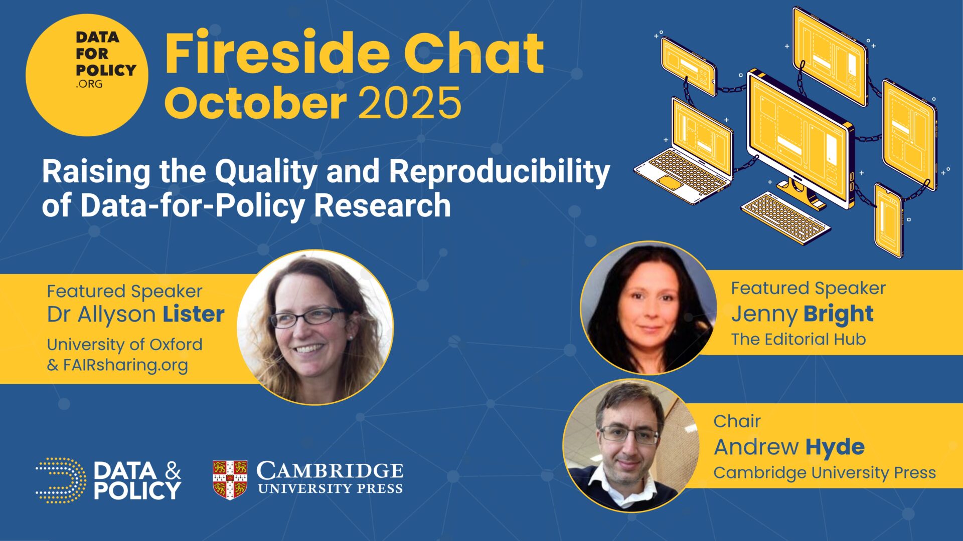 In October 2025, our Fireside Chat series brought together experts to discuss how to enhance research transparency and reproducibility in the Data & Policy journal and the broader data-for-policy community. Andrew Hyde (Cambridge University Press) chaired the session with Dr Allyson Lister (FAIRsharing.org, University of Oxford) and Jenny Bright (The Editorial Hub). Drawing on lessons from the Tier 2 Project, the speakers outlined how Data & Policy has integrated the Editorial Reference Handbook into its editorial workflow to strengthen data integrity, FAIR principles, and collaborative research standards. Learn More